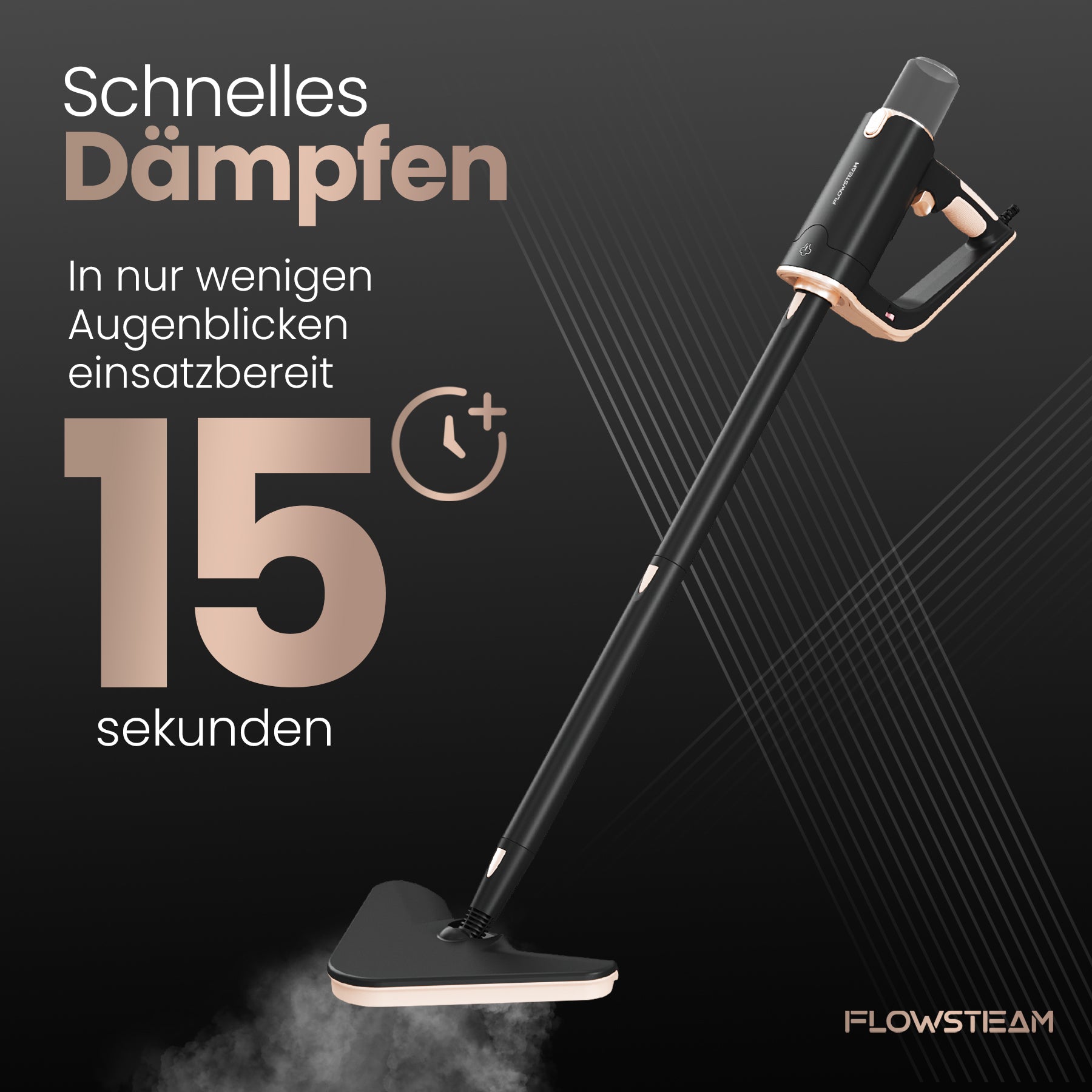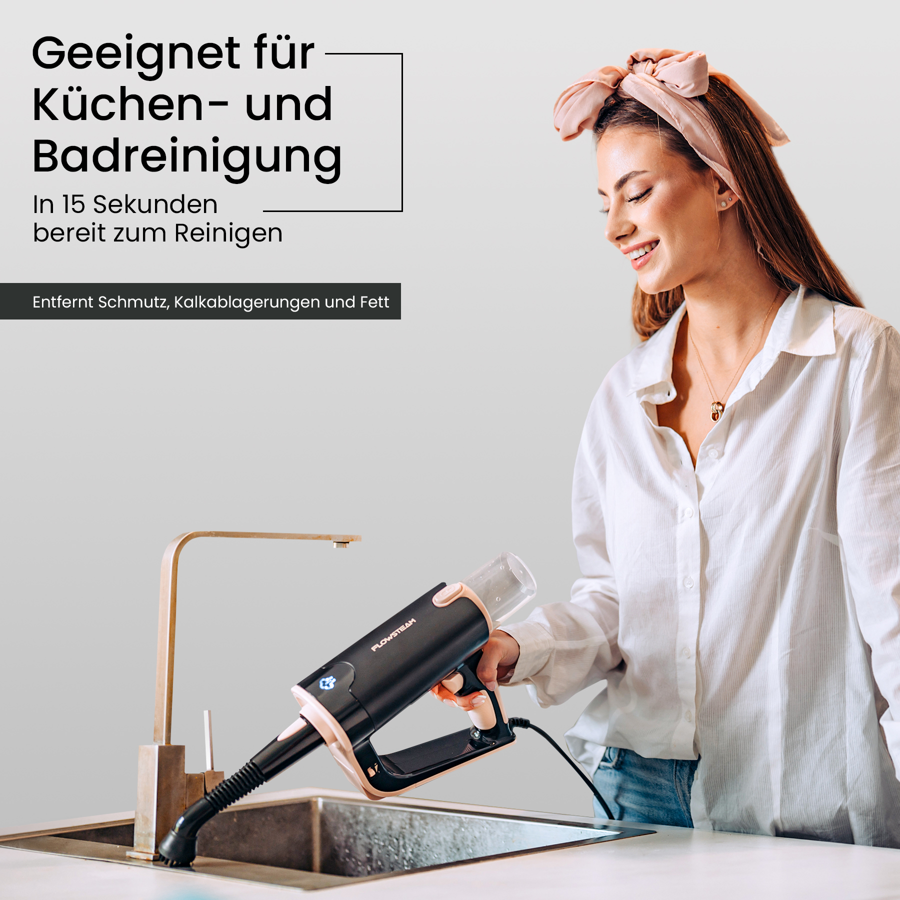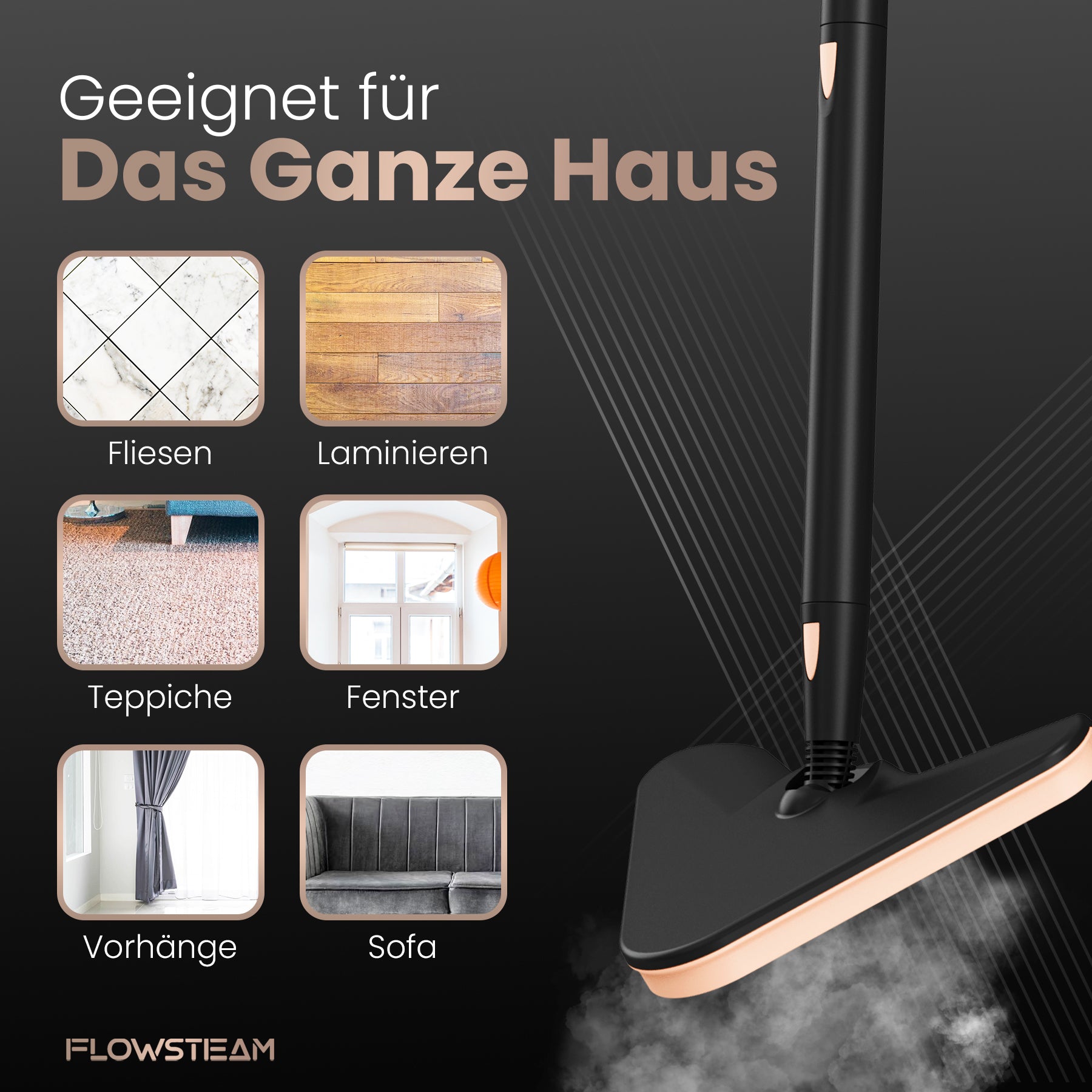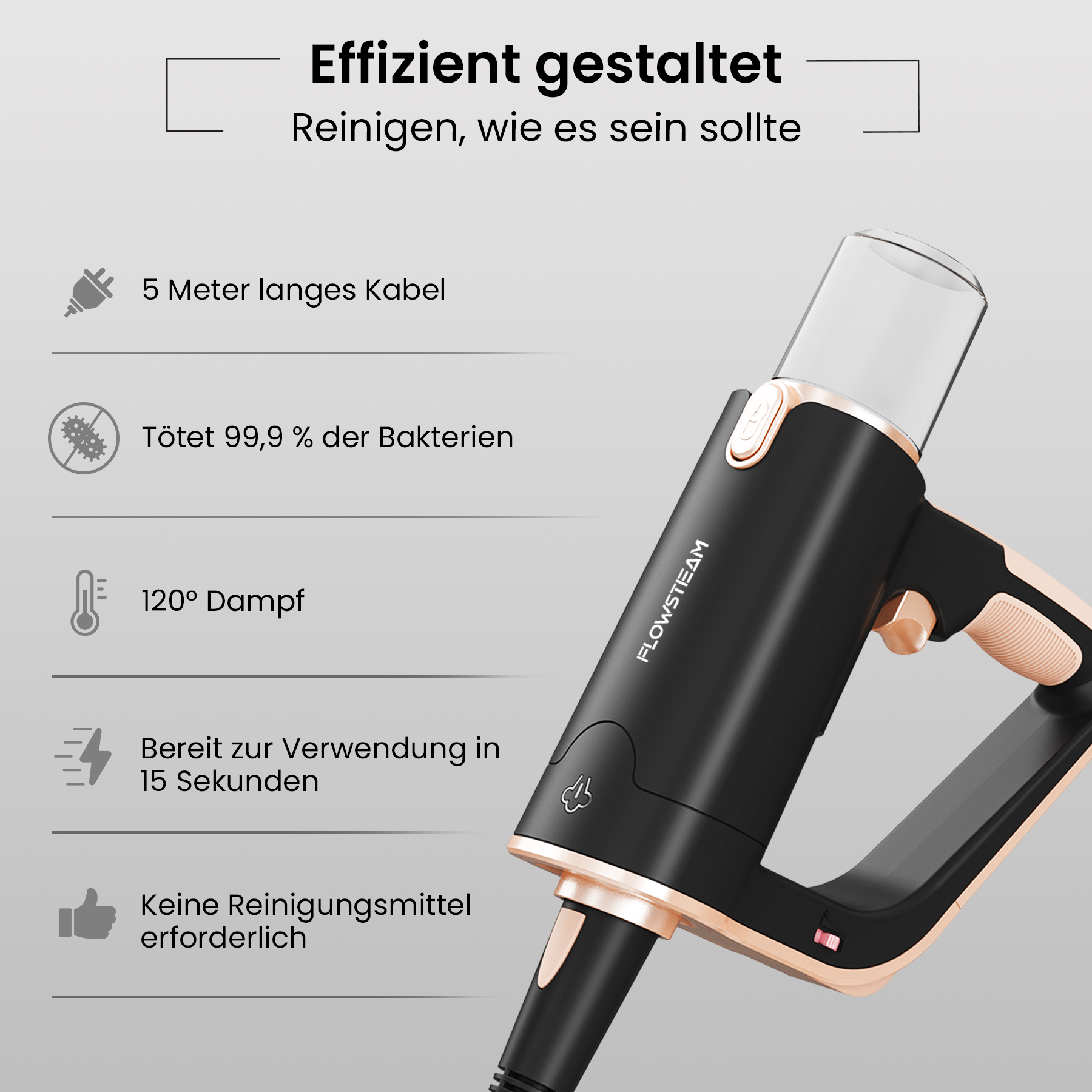 Entdecke den FLOWSTEAM-Dampfreiniger: die smarte Lösung für ein sauberes Zuhause. In nur 15 Sekunden einsatzbereit, mit Dampf bis zu 120 °C und 13 Aufsätzen für jede Oberfläche. Verwende ihn als Handdampfer oder Dampfmopp – für Böden, Möbel und Fenster. Dank des kompakten Designs, des langen Kabels und des abnehmbaren Wassertanks wird Reinigen leichter als je zuvor. Für alle, die schnell und gründlich reinigen möchten, ganz ohne Aufwand.