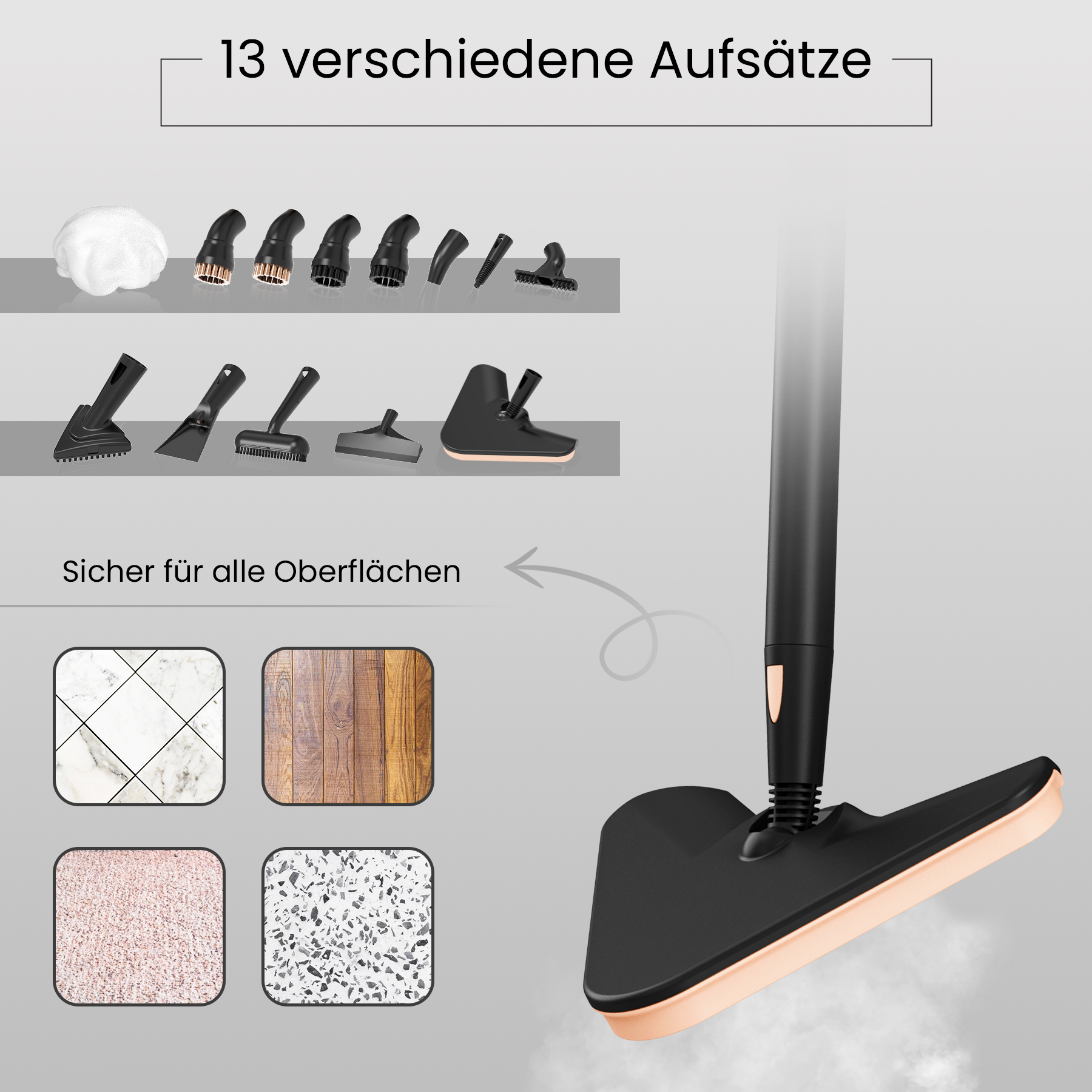 Unser Dampfreiniger bietet eine kraftvolle, hygienische und umweltfreundliche Möglichkeit, dein Zuhause gründlich zu reinigen. Entdecke, wie du mit purem Dampf nicht nur effektiv putzt, sondern auch zu einem nachhaltigeren Lebensstil beiträgst.