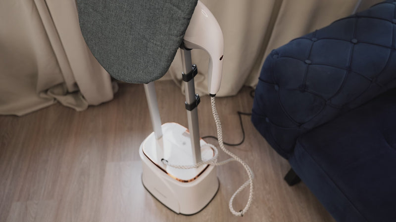 FLOWSTEAM Kledingstomer witBlonde vrouw stoomt kleding met de FLOWSTEAM Kledingstomer